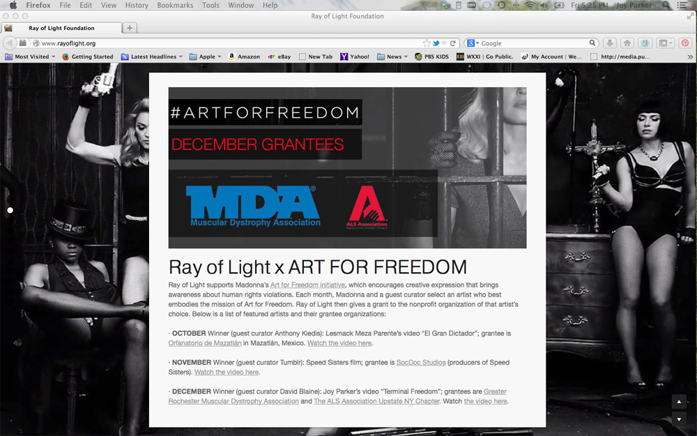 I got an email in January 2014 from a rep for Ray of Light Foundation saying “The video was chosen for the month of December 2013 by Madonna and celebrity curator David Blaine to win a $10,000 grant from the Ray of Light Foundation. ”