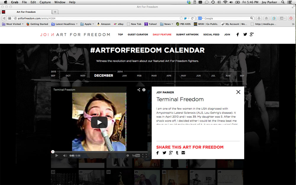 So in November 2013, I uploaded a video piece to the Art for Freedom project about having ALS and what freedom means to me. More about project.