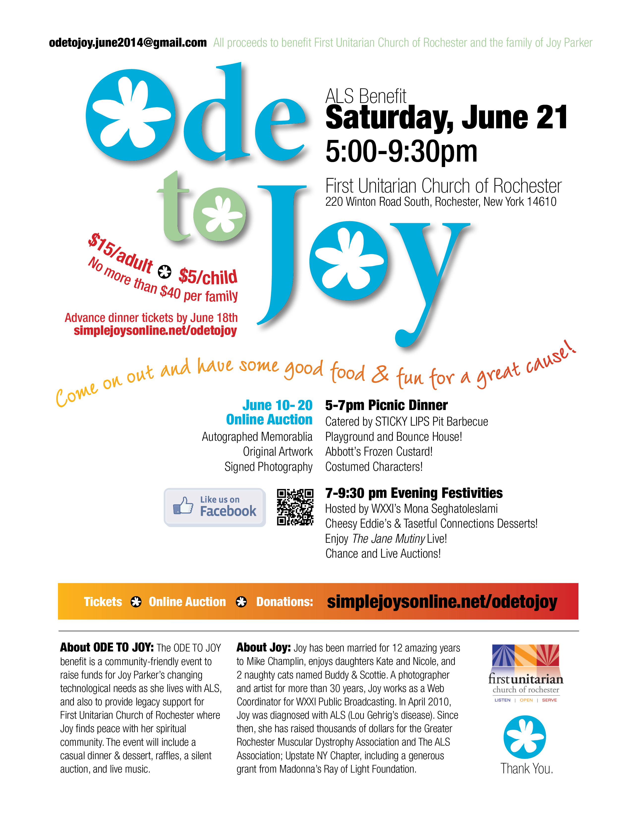Event is June 21st 5-9:30pm The ODE TO JOY benefit is a community-friendly event to raise funds for Joy Parker’s changing technological needs as she lives with ALS, and also to provide legacy support for First Unitarian Church of Rochester where Joy finds peace with her spiritual community.